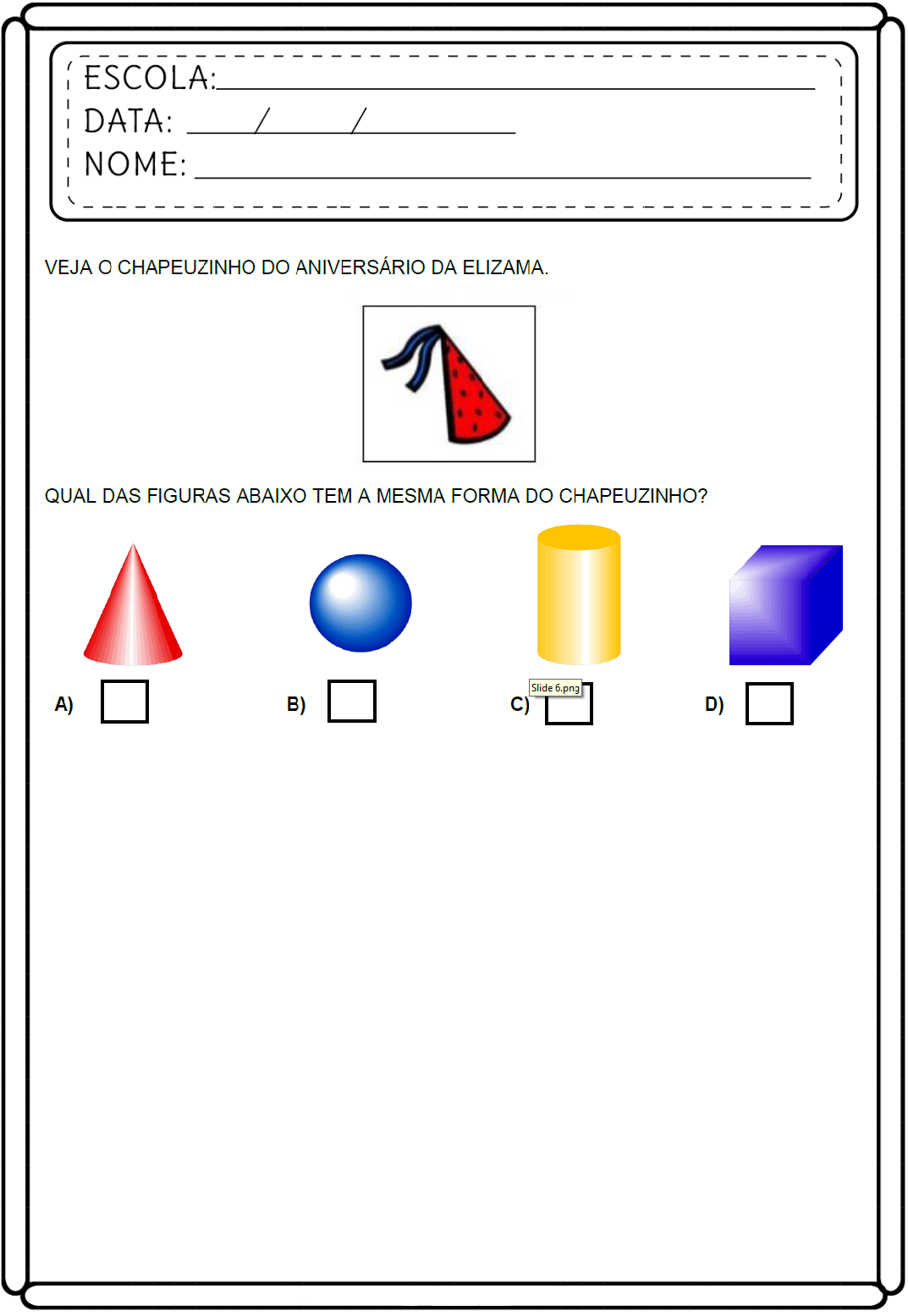Veja o chapeuzinho do aniversário da Elizama. Qual das figuras abaixo tem a mesma forma do chapeuzinho?